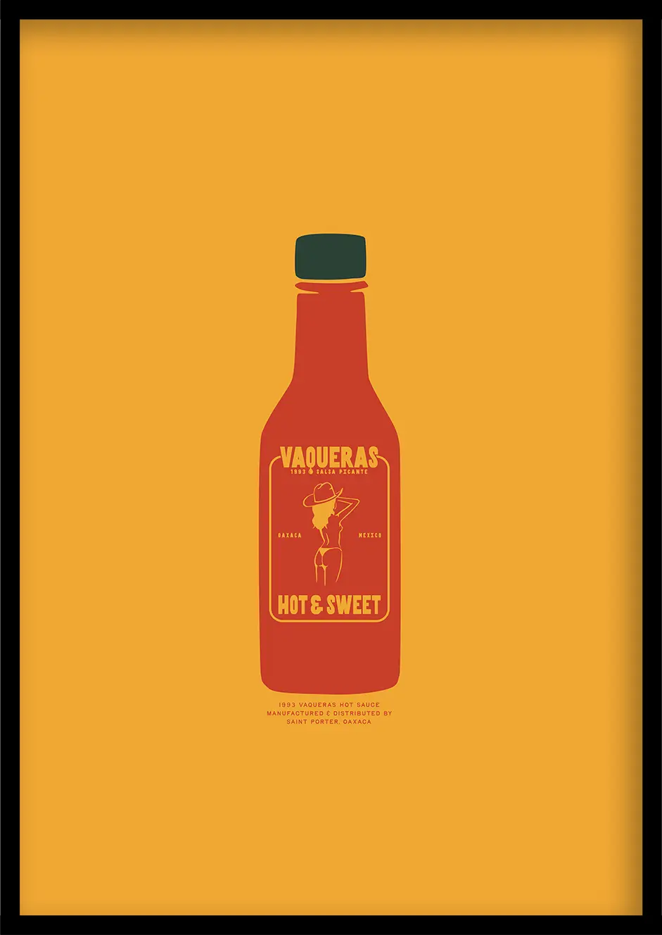 Art prints with a kick! Our Vaqueras hot sauce design features a daring female figure illustration alongside iconic typography. Get ready to add a fiery twist to your interiors with this unique yet minimal bottle-design art print. Vaquera’s hot sauce is more than just a condiment; it’s a statement.